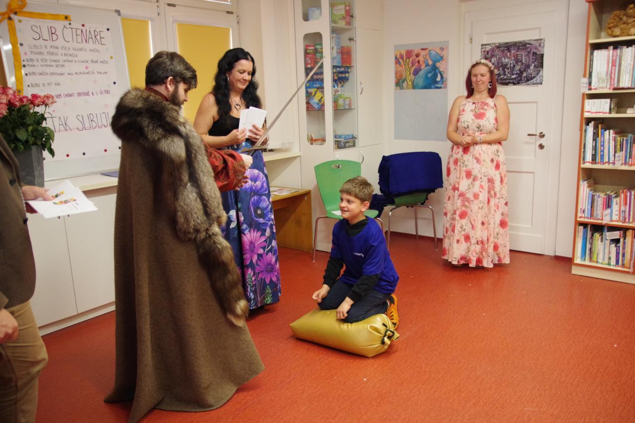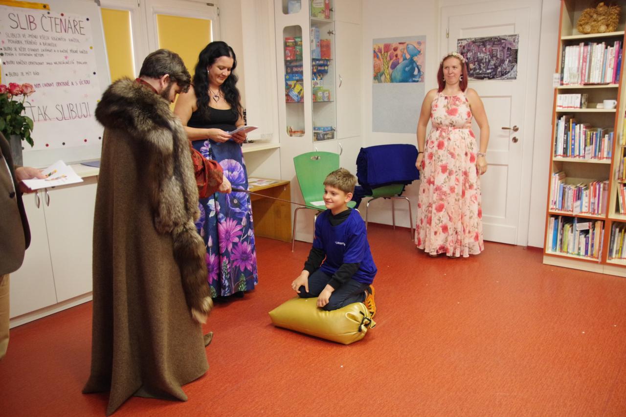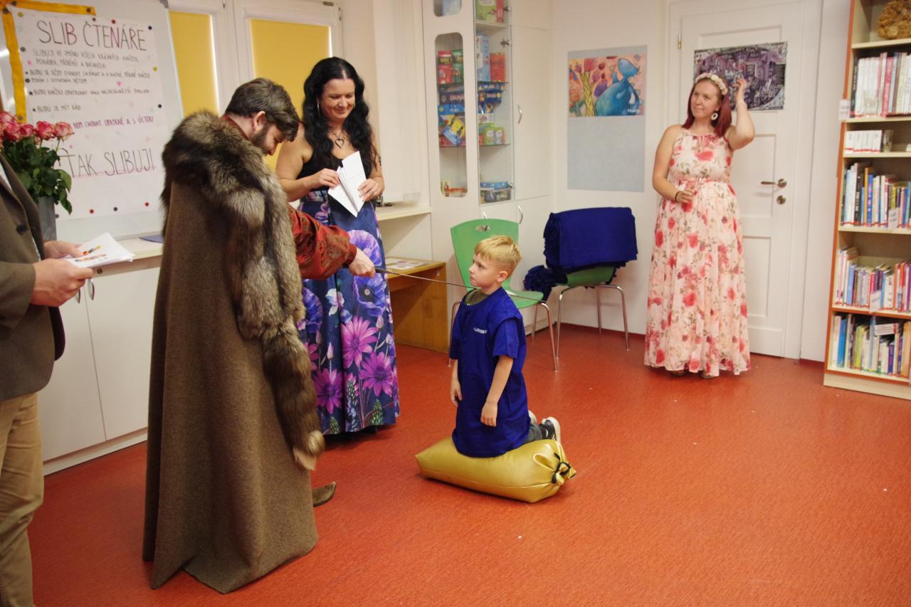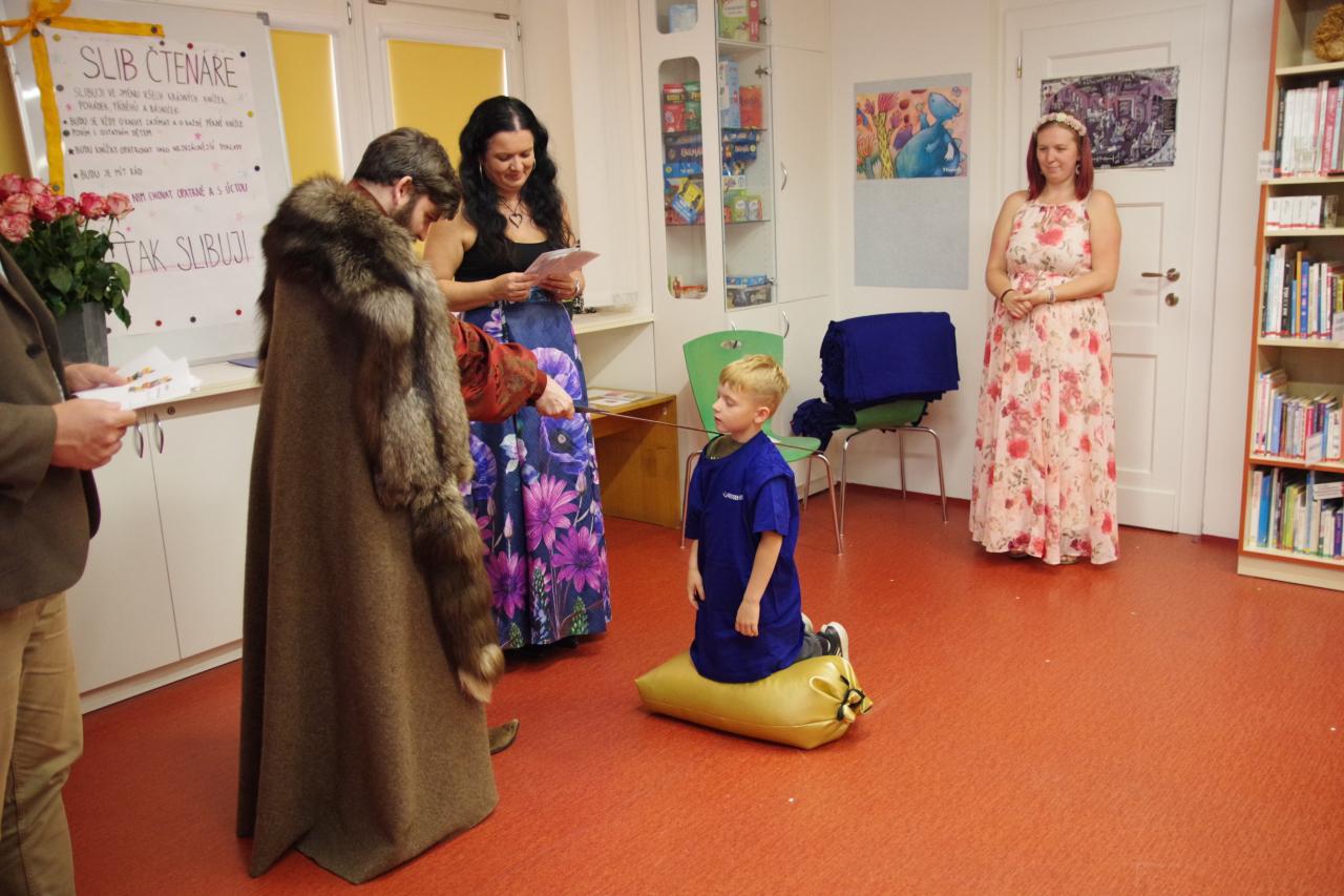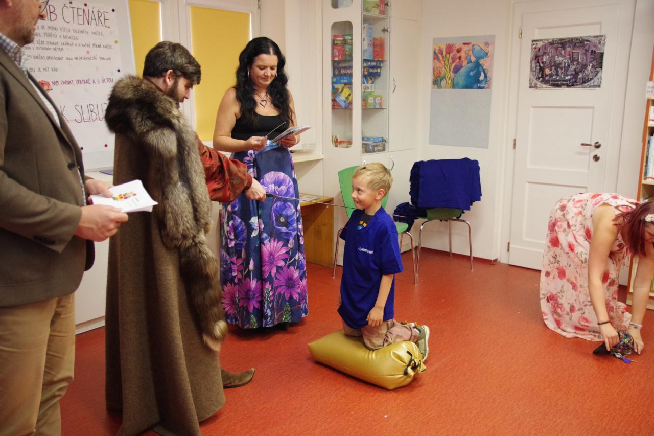 Po krátkém úvodu nám děti přečetly básničky a dokázaly nám tím, že jsou hodny být pasovány. Složily "Čtenářský slib" a poté pan rytíř pasoval 82 dětí. Nechyběly ani dárečky. Čtenářský glejt a poukázka na rok do knihovny zdarma. Děti byly pasovány v kouzelném tričku. Na závěr celé slavnosti děti kouzlily s panem kouzelníkem Mr. CARLO na sále Pellyho domů.
