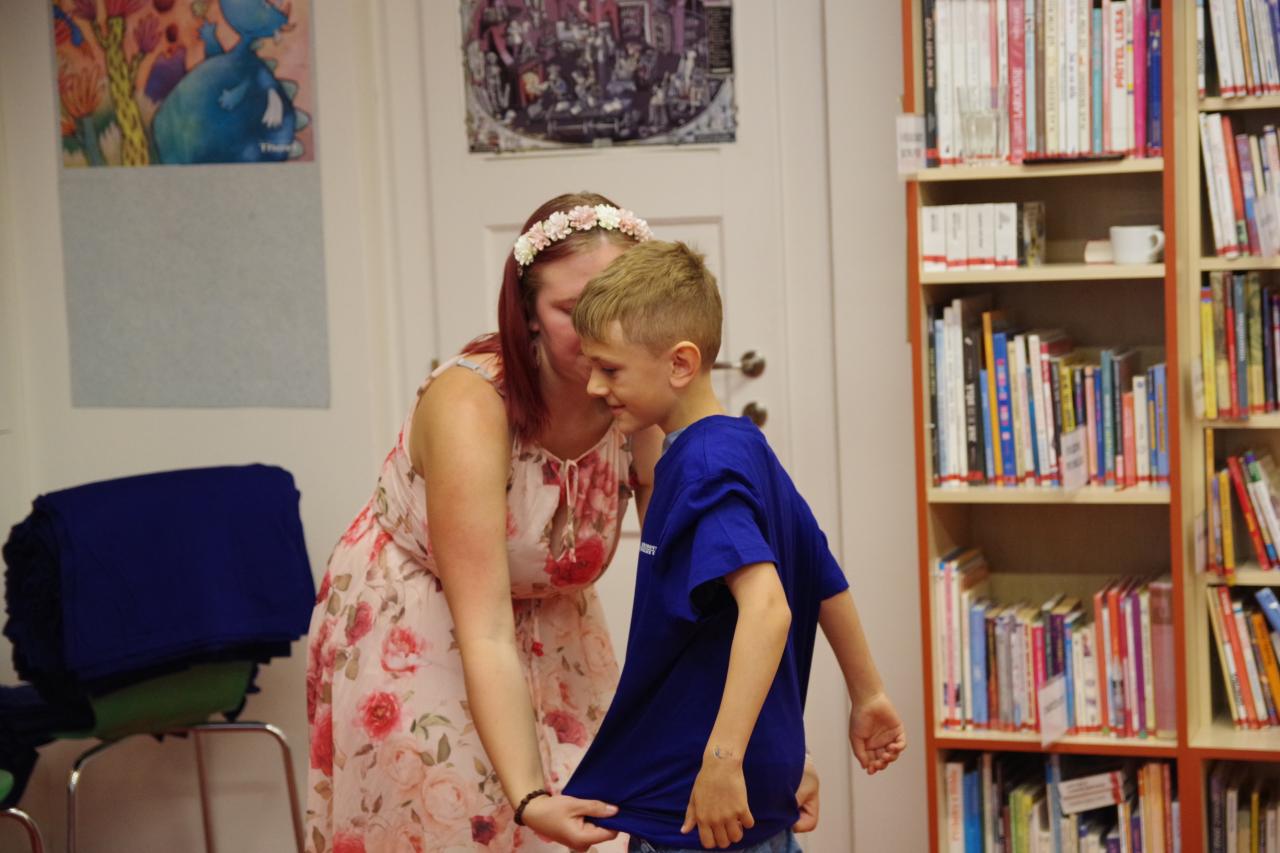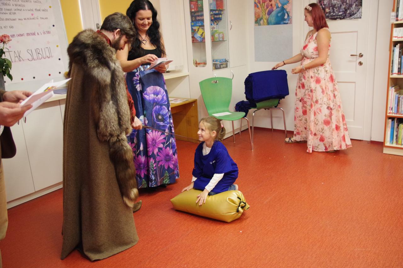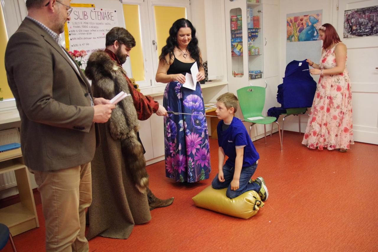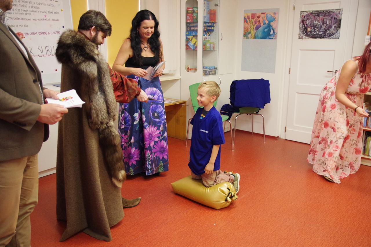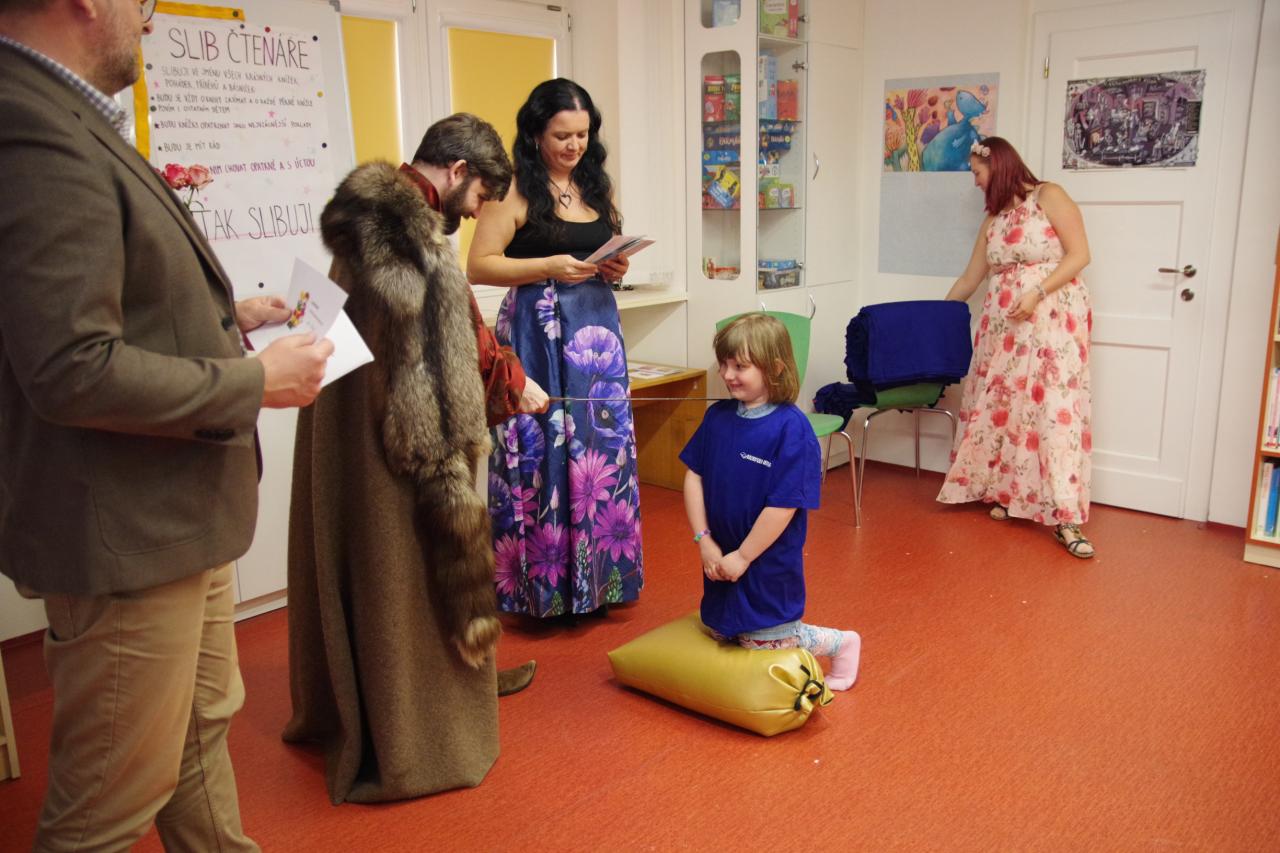 Po krátkém úvodu nám děti přečetly básničky a dokázaly nám tím, že jsou hodny být pasovány. Složily "Čtenářský slib" a poté pan rytíř pasoval 82 dětí. Nechyběly ani dárečky. Čtenářský glejt a poukázka na rok do knihovny zdarma. Děti byly pasovány v kouzelném tričku. Na závěr celé slavnosti děti kouzlily s panem kouzelníkem Mr. CARLO na sále Pellyho domů.