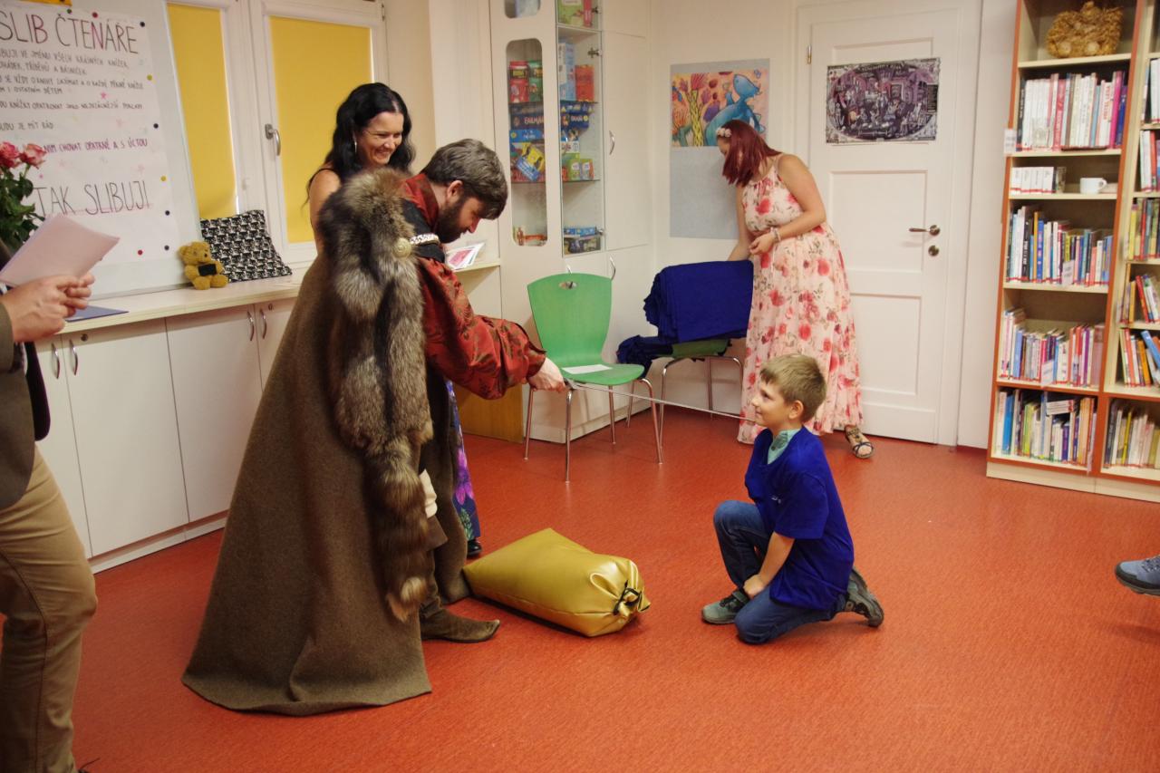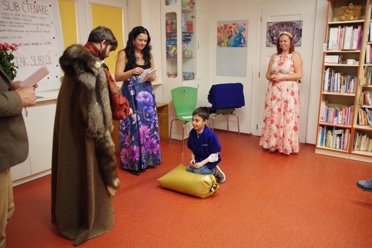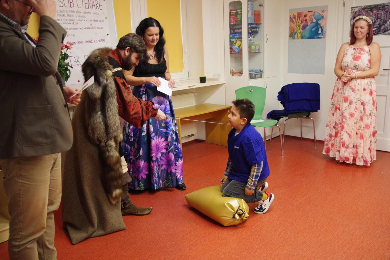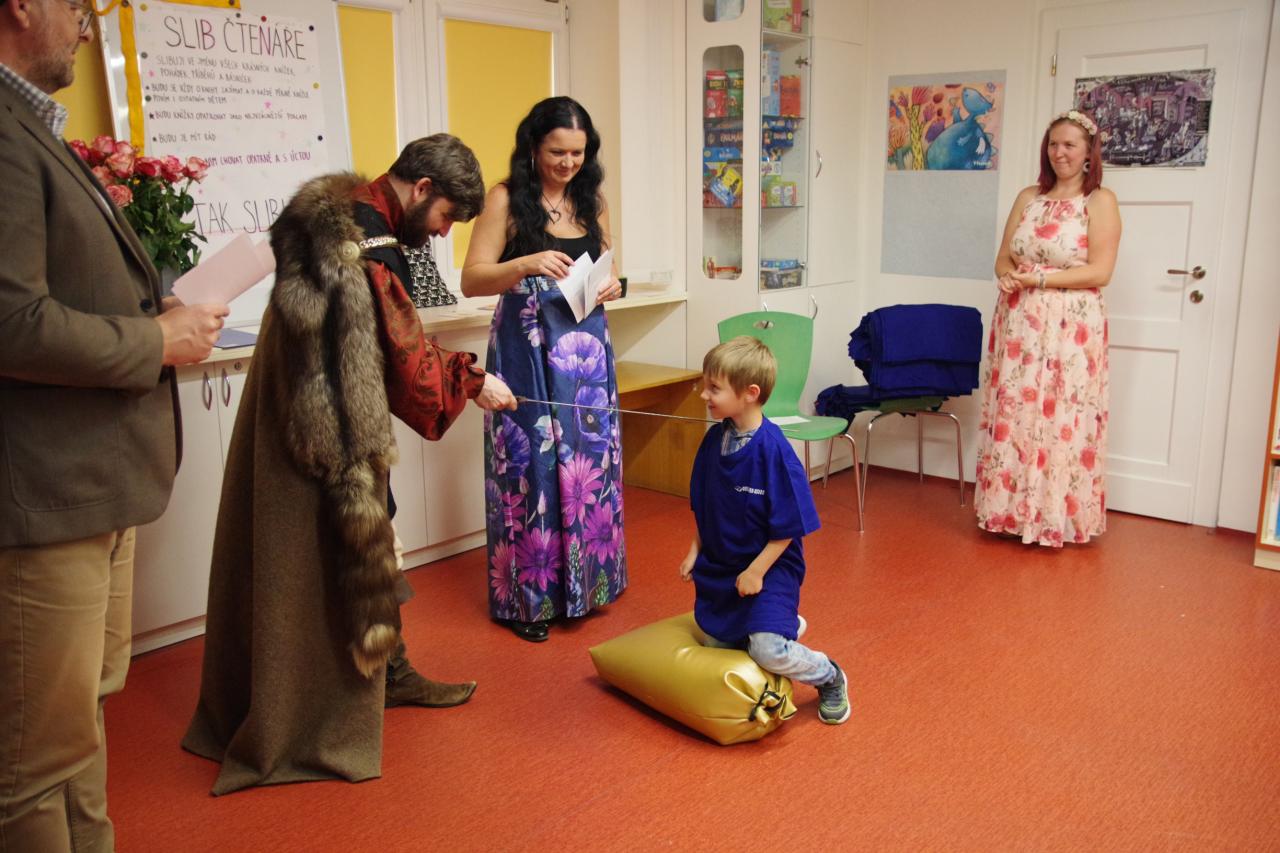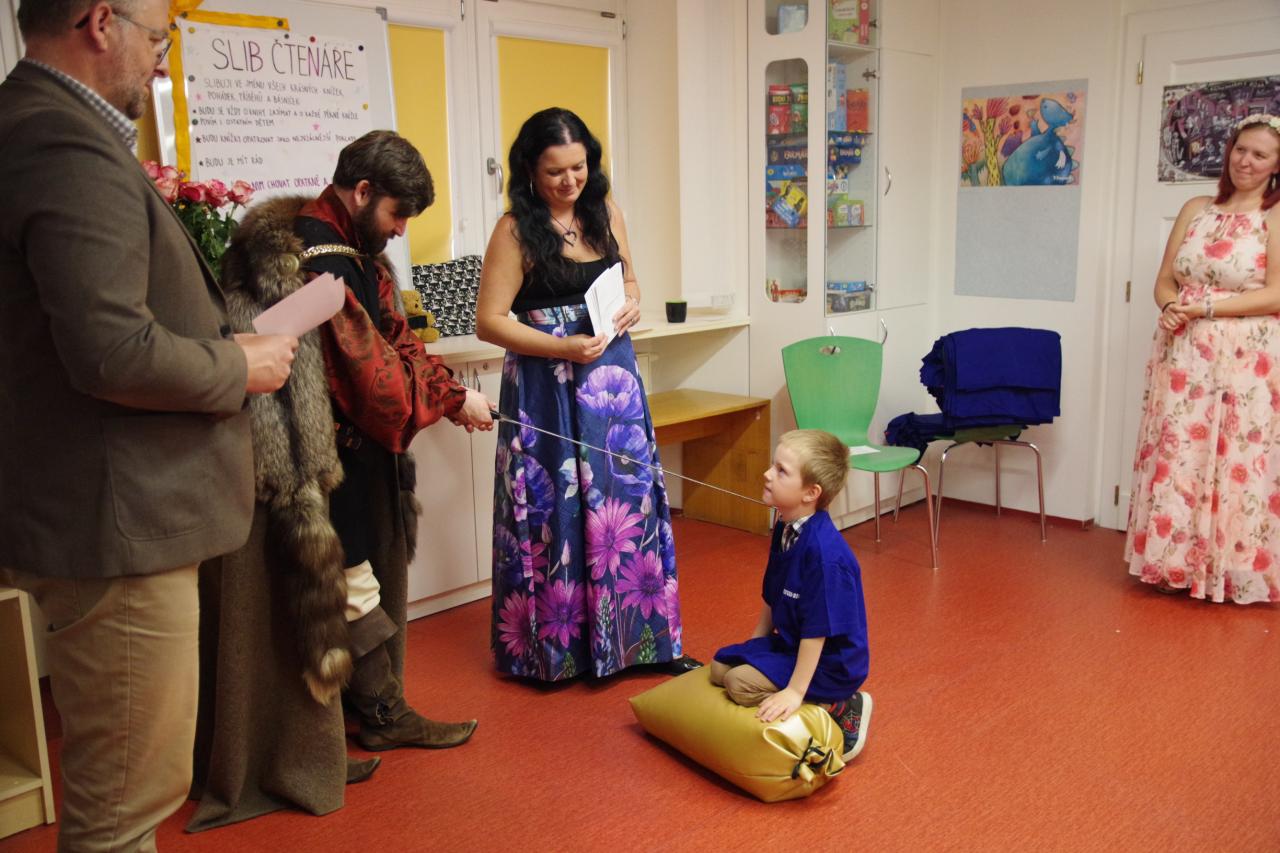 Po krátkém úvodu nám děti přečetly básničky a dokázaly nám tím, že jsou hodny být pasovány. Složily "Čtenářský slib" a poté pan rytíř pasoval 82 dětí. Nechyběly ani dárečky. Čtenářský glejt a poukázka na rok do knihovny zdarma. Děti byly pasovány v kouzelném tričku. Na závěr celé slavnosti děti kouzlily s panem kouzelníkem Mr. CARLO na sále Pellyho domů.