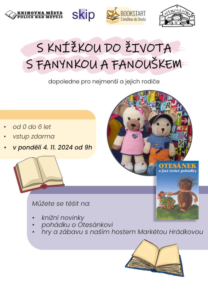 V pondělí 4. 11. od 9 do 11 hodin do dětského oddělení zveme maminky spolu s dětmi na další setkání v rámci projektu BOOKSTART -S knížkou do života s Fanynkou a Fanouškem. Můžete se těšit na knižní novinky, pohádku o Otesánkovi a na hry a zábavu s naším hostem Markétou Hrádkovou (instruktorkou fitness, cvičení maminek s dětmi